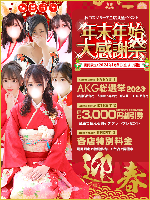 ✧イベント2【ご新規様特典】✧ 大変お得なチケットを皆様に配布 期間中に初めてご利用のご新規様に 秋コスグループ全店でご利用可能となる 最大3000円分の割引チケットをプレゼント ■有効期限:2024年1月6日~2024年3月31日